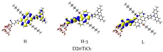 The oscillation strengths of the Vis bands are in the range of 0.938 to 0.987, while the values of the UV bands are in the range of 0.762 to 0.924. Compared with D2, the Vis bands of the designed dyes are slightly blue-shifted. Despite this, as we mentioned previously, they have better oscillation strengths and thus higher LHEs which enhance the values [45]. In addition, the transition character is attributed to molecular orbitals other than the LUMO and HOMO orbitals, implying that ICT is the predominant factor affecting these transitions rather than π → π* transitions. The charge density of the FMOs of isolated dyes involved in the major transitions is illustrated in Table 2.