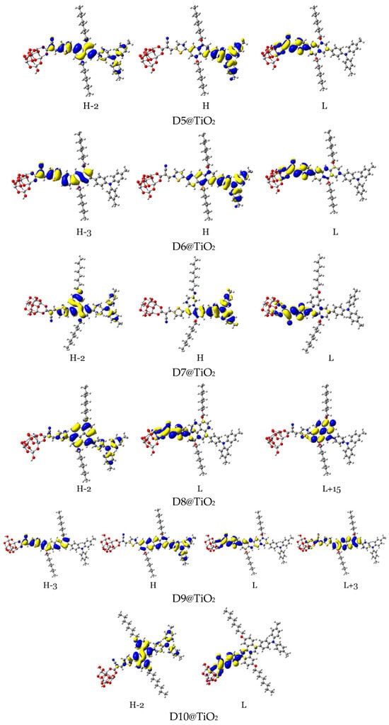 Alternatively, the ground-state dipole moments of the TiO2- and dye@TiO2-adsorbed systems are also presented in Table S6. As we can see, the dipole moment of TiO2 is only 1.941 Debye, and after the adsorption process, the dipole moments of the dye@TiO2-adsorbed systems are elevated to a great extent, ranging from 5.847 to 10.674 Debye. In addition, the dipole moments of the three adsorbed systems, D5@, D6@, and D8@TiO2, are larger than their isolated dyes, indicating an elevation in their charge transport properties [45].