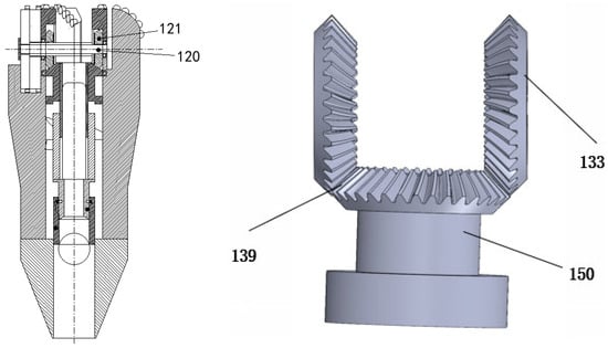 Schlumberger proposed indexable roller bit technology [17]. The left side of Figure 1 shows a sectional view of the assembly of the roller bit, while the right side of Figure 1 shows a schematic diagram of the roller engagement. The roller (133) on the bit is equipped with a driving mechanism (150) which is connected to the rotation mechanism (139). The driving mechanism can drive the rotation mechanism to rotate to a pre-determined position and fix it. The indexing mechanism (120) rotates the cone (121) and enables the teeth at different positions on the cone to break rock. When the teeth at a certain position are worn, the indexing mechanism can be driven to rotate and fix again to break rock with the teeth at a new position.