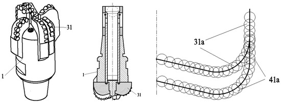 In 2018, the Drill Research Institute of Southwest Petroleum University proposed a long-life PDC bit with a translation blade [18]. The left side of Figure 2 shows a three-dimensional schematic diagram of a long-life PDC drill bit, the middle part of Figure 2 shows a cross-sectional view of the long-life drill bit, and the right side of Figure 2 shows a radial coverage tooth layout diagram for the long-life drill bit. The drill bit has a retractable translation blade (31), which is in a retracted state at the initial working stage of the drill bit (1), and does not participate in rock-breaking. When the cutting teeth (41a) on the fixed blade reach a certain degree of wear, the cutting structure (31a) of the translation blade stretches to the preset working position and is locked through the ground remote control, thus replacing the old cutting structures.