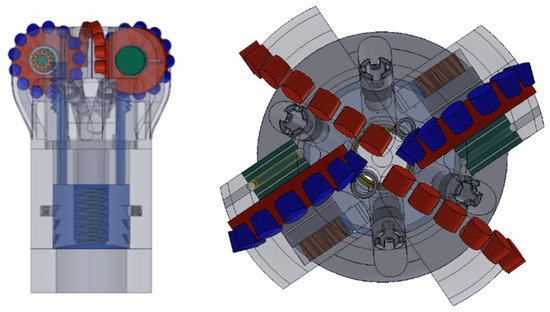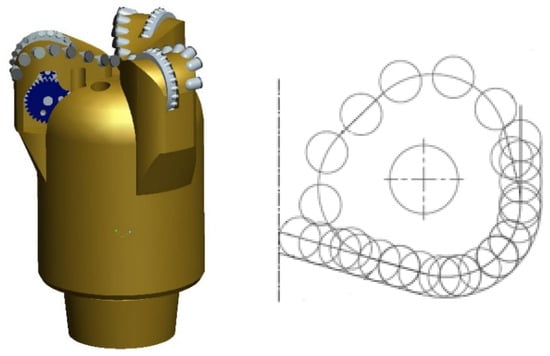On the basis of a disc cutter bit and cross-scraping PDC bit technology, the bit research institute of Southwest Petroleum University has put forward a bit with a renewable cutting structure, comprising rotary disc cutter bit technology; that is, the rotary cutter wing (disc cutter) of the bit can be controlled to rotate [25]. The left side of Figure 3 shows a schematic diagram of a rotating renewable drill bit. The basic idea of this technology is that the disc cutter on the drill bit can be controlled to rotate to a preset working position and locked. When the bit is working in the bottom hole, if the initial cutting teeth are worn, the disc cutter can be rotated on the ground through remote control, such that the worn teeth are replaced with new cutting teeth to continue drilling. Therefore, the bit can complete multiple updates of the cutting structure in the bottom hole, achieving the effect of replacing the bit at the bottom hole without tripping. On the basis of the above ideas, the Drilling Research Institute of Southwest Petroleum University has continued to put forward technical schemes for non-disc cutter bits, where the disc cutter is designed instead as a curved polygon. The curved edge of the non-disc cutter can be designed according to the cutting contour of the drill bit, which matches the cutting contour of the drill bit. On the right side of Figure 3, the radial tooth layout diagram of the rotating renewable drill bit is shown. This scheme breaks the constraint of the idea of a circular disc cutter, and can be customized and flexibly designed according to the environment in which it is used and the conditions of the drill bit. The number of cutting structures on the drill bit is determined by the number of sides of the polygon [26,27,28,29,30,31].