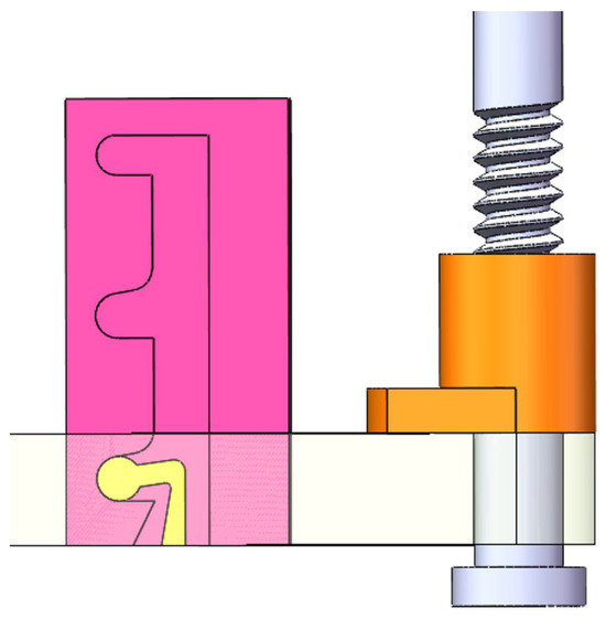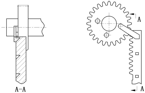 The self-renewal wheel axis is vertical to the radial direction of the drill bit, and is connected with the drill bit through the wheel shaft to achieve support on both sides. The axial locking of the self-renewal wheel is realized through the ball. The self-renewal wheel, worm wheel, and wheel shaft are connected through the spline. The worm axis is parallel to the drill bit axis. The lower end of the worm is connected with the ball screw through a coupling. A bearing is arranged at the upper end of the worm and the lower end of the screw. The piston is connected with the ball screw through the connecting rod. A ratchet groove limiting and locking mechanism is arranged at the connecting rod, as shown in Figure 8 as a schematic diagram. When the drill bit works normally, the cutting teeth on the renewable wheel are fixed teeth. Due to the self-locking effect of the worm wheel and worm, the worm wheel cannot drive the worm to rotate, ensuring that the renewable wheel will not rotate reversely and the spring at the center of the drill bit is in a compressed state, causing the piston member to move downward. Due to the one-way locking performance of the ratchet groove, the piston is in a balanced state, thus locking the ball screw. When the drill bit needs to be updated, the pressure on the bearing surface of the piston increases, such that the piston moves upward, causing the ball screw to move, the worm to rotate and, finally, the renewable wheel to rotate. When the connecting rod moves to the ratchet groove position, limiting and locking can be completed.