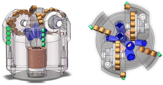 Three-dimensional models of a worm-driven self-renewal drill bit are shown in Figure 7. The driving mechanism is the worm gear mechanism, the trigger mechanism includes the piston component connected with the rack, the lower end of the piston component is provided with a bearing surface, the transmission structure is a ball screw, the core of the drill is provided with a reset spring mechanism, and the limiting and locking mechanisms have a ratchet groove structure.