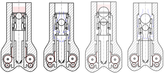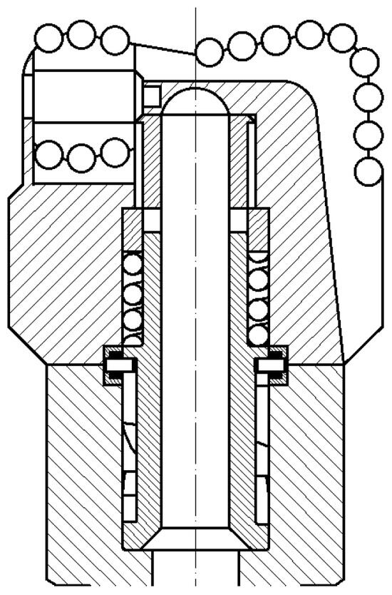 Figure 14 shows the trigger device for starting the drill bit pressure. In the pressure triggering device, the elastic coefficient of the safety spring above the pressing member is greater than that of the starting spring below the rotating member, and the pressure at which the safety spring deforms is 2–3 times the maximum value of the normal working bit pressure. When the bit is under normal bit pressure, the press-type rotating device will not start; when the bit needs to be renewed, the upper safety spring will be deformed after 2–3 times the maximum conventional weight is applied to the bit, and the press-type rotating device under the safety spring begins to operate.