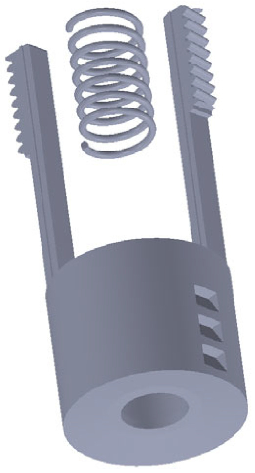 Three-dimensional models of a ratchet-driven self-renewal drill bit are shown in Figure 9. The drive mechanism is a ratchet mechanism, the trigger mechanism is a ratchet shaft, the lower end of the ratchet shaft is provided with a bearing surface, the transmission structure is a pair of bevel gears, a return spring mechanism is provided between the bevel gear and the ratchet shaft, and the limit and locking mechanisms are ratchet groove structures on the ratchet shaft.