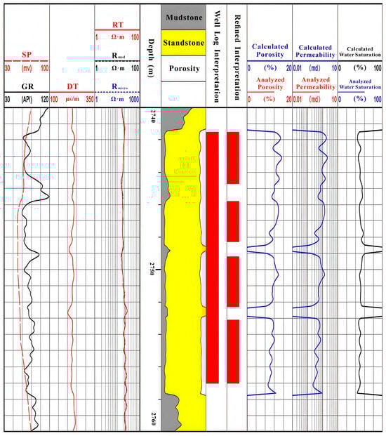 Interlayers are primarily influenced by changes in the hydrodynamic environment during the sedimentary process [36,37]. Typically, due to a weakening of the hydrodynamics, a large amount of fine-grained suspended material is deposited, forming argillaceous interlayers. The main logging response for argillaceous interlayers is a finger-like uplift in the gamma ray (GR) curve, a return phenomenon in the natural potential (SP) curve, and an expansion of the borehole diameter. Among these, the gamma ray logging curve is the most sensitive to argillaceous interlayers. Calcareous interlayers are primarily related to diagenetic processes such as cementation and dissolution of sediments. As a result, they are characterized by random distribution, poor continuity, and relatively thin thickness. The logging response is mainly represented by deep lateral resistivity being higher than or close to the resistivity of the oil layer, the microelectrode curve showing sharp peaks with small amplitude differences, and the sonic time difference exhibiting low values. There is no borehole expansion observed. Among these, the deep lateral resistivity logging curve provides the best reflection of calcareous interlayers. Figure 1 shows core images of calcareous interlayers and argillaceous interlayers, and Figure 2 shows that the logging response characteristics differ for each type of interlayer. The logging response characteristics of argillaceous interlayers are as follows: an increase in GR, and a decrease in Porosity (Por) and Permeability (Perm). These are generally of sedimentary origin. The logging response characteristics of calcareous interlayers are as follows: an increase in Resistivity (RT, RS), and a decrease in Porosity (Por) and Permeability (Perm). These are generally of diagenetic origin. The influence of argillaceous and calcareous interlayers on reservoir fluid flow is primarily a blocking effect. Both types exhibit low porosity and low permeability characteristics. For the logging interpretation results, both show finger-like depressions in porosity and permeability. Therefore, the gamma ray logging curve and the deep lateral resistivity logging curve, which are more sensitive to these interlayers, are chosen as the main criteria for identifying the two types of interlayers, with the results verified by the porosity interpretation.