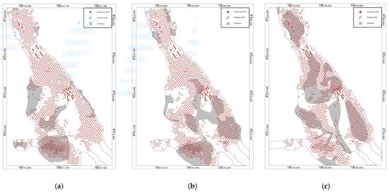 Planar distribution patterns of interlayers within sublayers; (a–c) represent different sublayers in the P Oilfield.