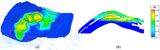 Oil saturation field map of a sublayer after five years of production. (a) Oil saturation field map. (b) Cross-sectional profile. (a), the red lines represent the trajectories of the horizontal wells. The red ellipses in both (a,b) correspond to the same region, indicating the areas of remaining oil accumulation.