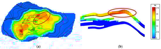 Oil saturation field map of another sublayer after five years of production. (a) Oil saturation field map. (b) Cross-sectional profile. (a), the red lines represent the trajectories of the horizontal wells. The red ellipses in both (a,b) correspond to the same region, indicating the areas of remaining oil accumulation.