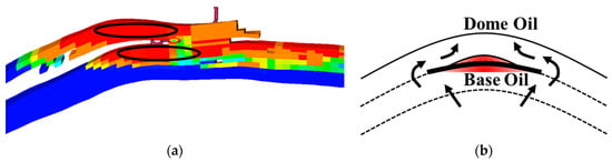 Figure 7a shows the cross-sectional view of residual oil distribution, while Figure 7b illustrates the schematic model of dome oil and bottom dome oil. The red areas in the figures represent the dome oil and bottom dome oil formed by interlayer barriers, which are challenging to be effectively extracted by existing production wells. Wells can hardly effectively produce them. Moreover, as development progresses, after the oil well starts to produce water, its swept area will also be relatively fixed. Therefore, certain measures must be taken to tap the potential of such remaining oil. Generally speaking, the methods of sidetracking old wells or drilling new infill wells have a relatively good effect on tapping the potential of this kind of remaining oil. Tapping the potential by increasing the liquid production and supplementing oil has a relatively limited effect. However, in the early stage, the method of increasing the liquid production can be adopted to increase the flow rate, expand the swept area, and improve the recovery degree. In the later stage, this method cannot be used to tap the potential.