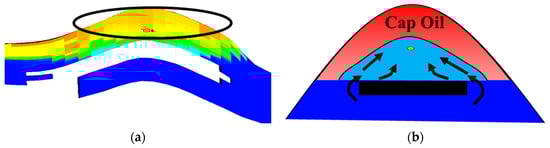 Remaining oil distribution characteristic map. (a) Remaining oil cross-sectional profile. (b) Cap oil pattern map. (a) the black ellipse indicates the region where Cap Oil are located within the reservoir numerical model. (b) the black arrows represent the direction of water movement, and the red area denotes the remaining oil, the light blue and dark blue areas both represent the bottom water of the reservoir.
