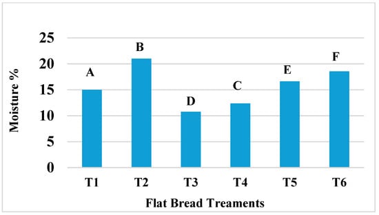 The moisture content differed significantly (p < 0.05) among all flatbread recipes and ranged from 10.78% (T3) to 20.99% (T2) (Figure 1). Notably, each of the three flatbread treatments with infused spinach, T2, T4, and T6, had significantly higher moisture levels than their counterparts without spinach. The treatment T2 that was formulated with 100% WF and local spinach had the highest moisture content of 20.99%. This was followed by moisture content of 18.55% for T6, which was also formulated with spinach but contained 50% OFSP flour. It was also reported that when spinach was added to crackers, a similar effect was seen and attributed to the presence of high amounts of hydroxyl groups associated with fibre in spinach, which initiates high bonding of water through hydrogen bonding [52]. The moisture levels of the OFSP flour and infused spinach treatments were higher than those conveyed in OFSP flour–maize blends of flatbread reported by other researchers [49]. Some studies have revealed that a higher fibre content in OFSP flour than in WF is responsible for higher levels of moisture [30,33] while another study by Roger et al. [44] reported that the higher level of functional groups of proteins in WF, in comparison to sweet potato flour, played a crucial role in forming more hydrogen bonds in water than in sweet potato flour. However, in this current study, the infused spinach had a stronger influence on moisture levels of the flatbreads than the WF and OFSP flour. The treatments T3 and T4 had a lower percentage inclusion of OFSP flour but higher levels of WF (than T5 and T6) and displayed the lowest moisture levels, of 10.78% and 12.36% respectively. Importantly, OFSP flour possesses one of the highest moisture levels among different varieties of sweet potato flour, but this can be affected by the genetic composition and cultivar of the sweet potato tuber [53], as seen in this study.