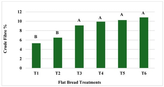 There were no significant differences (p > 0.05) in crude fibre percentage among all flatbread treatments that contained OFSP flour: T3, T4, T5, and T6 (Figure 2). Similarly, there was no significant difference in crude fibre content between T1 and T2, both of which contained WF. All four OFSP flour treatments (T3, T4, T5, and T6) contained significantly higher (p < 0.05) levels of crude fibre than the two 100% WF flatbreads. Furthermore, the crude fibre increased concomitantly with increasing levels of OFSP flour, resulting in T5 and T6, the treatments formulated with 50% OFSP flour, having the highest fibre levels, of 10.24% and 10.82%, respectively. This pattern was also observed in an experiment conducted with volume bread formulations containing OFSP–WF blends [54], bread formulations with WF and sweet potato blends [50] and OFSP flour–maize flour blends of flatbread [49]. It is noteworthy however, that, in this current research, the fibre levels, which ranged from 9.1% to 10.8%, were much higher than those reported by similar studies. It is widely recognized that spinach contains high levels of dietary fibre [55], and in this study, the infused spinach could have had some effect on the fibre content of the flatbreads even though no clear pattern of a significant effect was observed. This is supported by the higher levels of crude fibre in T2, T4, and T6, which were formulated with spinach. The significantly higher levels of crude fibre in the flatbreads formulated with OFSP flour signify that the inclusion of this type of flour adds value to the flatbread and serves as a high fibre option to meet the requirements for healthier food options. The health benefits of fibre are numerous, including playing integral roles in reducing the risks of diseases such as hypertension, diabetes, and colon cancer [23] and facilitating the digestion and absorption process in humans [49].