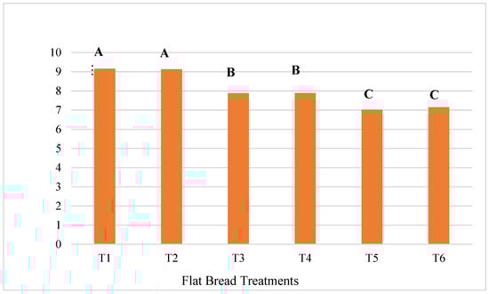 The CP content in T1 (9.15%) and T2 (9.13%), both representing the 100% WF treatments, was significantly higher (p < 0.05) than that in all the OFSP flour treatments (Figure 3). The flatbreads T3 and T4 had protein contents of 7.88% and 7.89%, respectively. Additionally, no significant difference (p > 0.05) was noticed in crude protein between T1 and T2, nor between T3 and T4, or T5 and T6. Moreover, the protein content decreased significantly from 7.88% to 7.02% as the level of OFSP flour increased in the treatments, compared to the control treatments of 9.15% (T1) and 9.13% (T2). Similar trends were revealed by Teferra et al. [49] for OFSP flour–maize blends of flatbread and by Okorie and Onyeneke [56] with cakes formulated with sweet potato flour–WF blends. Yıldız [57] reported that the protein gluten fraction in WF, which is absent in OFSP flour, is responsible for the higher levels of protein in WF products. There was no significant effect of the infused spinach on CP content in the flatbreads in this current study. This may be due to the amount and form in which it was incorporated into the flatbread. When powdered spinach was added to WF at levels of 20% and beyond, for bread making, it increased the protein levels significantly [28]. However, the level of spinach used in this study was 10%, which might have been too low to have a definite effect on CP content in the flatbreads.