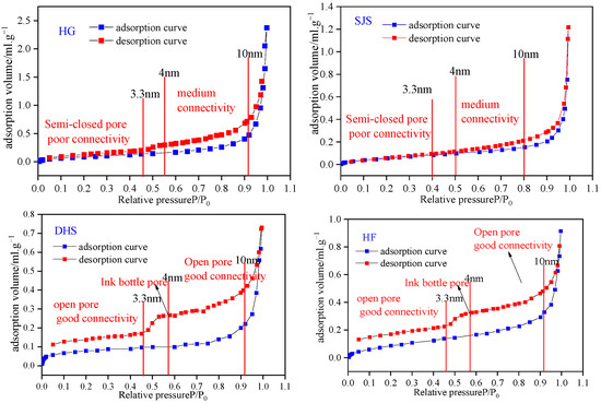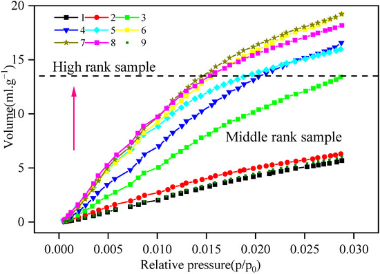 Adsorption pore types are studied by using LPN2 GA tests. Figure 1 shows that the adsorption isotherms of the nine coal specimens exhibit a type IV with H3 type hysteresis loop by using the classification method proposed by IUPAC [3,4,5,6,7,23]. Different adsorption curves are classified into three types by using pore types and connectivity.