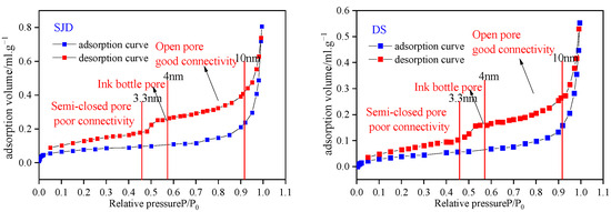 The hysteresis loop of type C samples (JZJ, SJD, DS, SB) is narrow when the relative pressure is less than 0.5, indicating that pores with a diameter is less than 4 nm are closed at one end, and the pore connectivity within this range is poor. The open pores and ink bottle pores in this type provide the main pore volume, while closed micro-pores provide the main pore surface area.