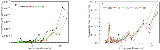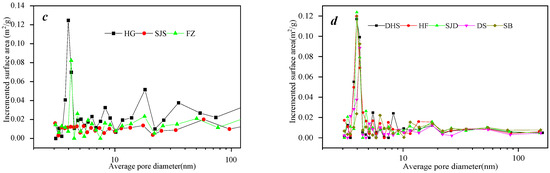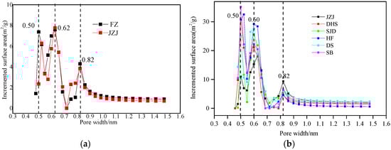 Incremental surface areas plots of DFT-microporous for the middle and high coals. (a,b) Incremental surface areas plots of DFT-microporous for the middle coals, Incremental surface areas plots of DFT-microporous for the high coals.