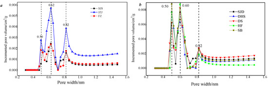 Incremental pore volume plots of DFT-microporous for the middle and high coals. (a,b) Incremental pore volume plots of DFT-microporous for the middle coals, Incremental pore volume plots of DFT-microporous for the high coals.