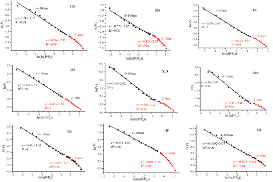 The above literature shows that can characterize the pore structure morphology, while can characterize the coal pore surface morphology [23,28,29]. Figure 6 shows that fractal curves could be divided into two parts; that is, the pore diameter is smaller than 4 nm when the relative pressure is smaller than 0.5, and the pore diameter is larger than 4 nm when the relative pressure is larger than 0.5. Therefore, pore volumes of (2–4 nm) (4–100 nm) were studied, and the results show that the linear relationship between the specific surface area percentage of 2~4 nm and is significantly better than that of 2~10 nm pores (Table 3).