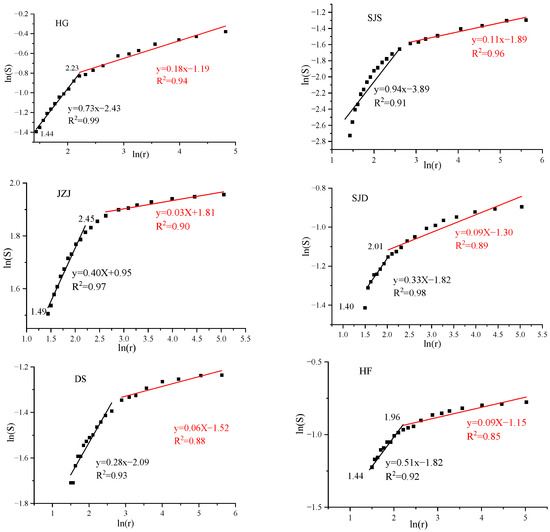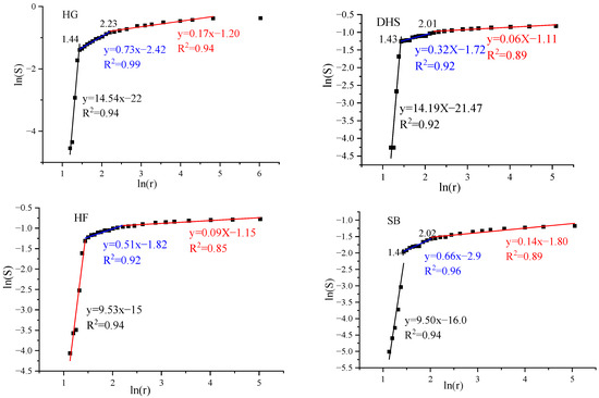 Based on Equation (3), the pore surface characteristics of LPN2 GA test data were studied. The boundary between lnS and lnr in the figure is roughly represented by ln(r) = (1.41–1.50) and (1.96–2.23), showing a clear three-stage structure. According to the average boundary value, it can be roughly divided into (2 < r < 4 nm)\ (4 nm < r < 10 nm)\(10 nm < r < 100 nm), indicating that the fractal characteristics of PDT relative to the volume in the adsorption pores are more obvious, and the SSA fractal law of the pores is more pronounced (Figure 7).