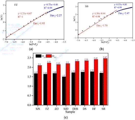 Volume fractal curve of the micro-pores through Sierpinski model (a,b), the volume fractal dimension of Dav1 and Dav2 of all the samples (c).