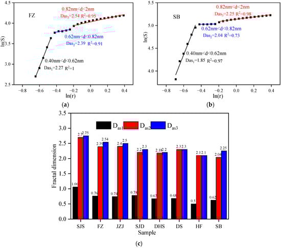 Based on Equation (3), surface area features of micropores are described. The surface integral curve is obviously expressed as three different fractal features with ln(r) = −0.45/−0.2 as the boundary, which correspond to the radius pores of d = 0.62 nm/0.82 nm, respectively. This result corresponds to the double peaks in Figure 10. With respect to consistency, it shows that there is a significant difference in the surface homogeneity of the pore area of 0.40~0.62 nm, 0.62~0.82 nm, and 0.82~2.0 nm in the microporous range. The combined diagram also further verifies that the surface area heterogeneity in the micropore range is obviously stronger than the volume heterogeneity. In addition, 0.40~0.62 nm, 0.62~0.82 nm, and 0.82~2.0 nm micropore ratio surface integral shape dimensions are expressed by \\, respectively. The range of in medium- and high-order samples is 0.50~1.06, and it shows a trend of gradual decrease with the increase in the degree of deterioration, indicating that the heterogeneity of the micropore surface of 0.40 nm < d < 0.62 nm is weak and the pore complexity tends to decrease with the increase of the pore surface area (Figure 10). The measured samples \ are 2.04~2.70 and 2.10~2.75, respectively, indicating that the 0.62 nm~2 nm micropore edge has a complex 2D surface [14]. The pores within this aperture range show two characteristics: the same sample < ≤ , indicating that in the same structural environment, the surface heterogeneity of the same coal order 0.62 nm~0.82 nm micropore is weaker than the 0.82~2.0 nm micropore pores, and the homogeneity of the micropore surface tends to stabilize with the decrease of the pore diameter; the surface fractal dimension with the increase in the degree of coal deterioration, the overall trend of gradual decreases, and the high coal stage gradually tends to be consistent; that is, ln(s) and ln(r) gradually evolve from three-stage to two-stage with the increase in coal rank. It shows that the transformation effect of the coal scale on the surface heterogeneity gradually weakens with the reduction of the aperture, and to a certain extent, it also shows that there are completely different pore characteristics in the micropore range with a boundary of 0.62 nm.