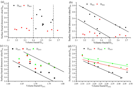 The relationship between volume fractal and surface fractal of adsorption pores based on LPN2/CO2 GA (a): the relationship between volume fractal and surface fractal; (b): the relationship between volume fractal and surface fractal; (c): the relationship between volume fractal and surface fractal; (d): the relationship between volume fractal and surface fractal.