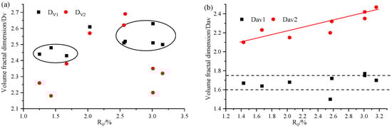 Studies have shown that the fractal dimension of coal is affected by the degree of coal metamorphism and composition [29,30,31,32,33]. The figure shows that the correlation between the volume fractal and vitrinite reflectance of each sample is higher than that of the surface fractal, and the fractal characteristics of micropores in the pore range have the best correlation with vitrinite reflectance (Figure 12). The seepage pore volume fractal of medium and high rank coal samples in the study area shows a linear increase with the increase in coal rank, but the correlation between pore volume fractal and coal metamorphism tends to decrease with the decrease in pore size, which is mainly related to the gradual decrease of pore volume in the stage. With the gradual increase in coalification, many micropores are developed in the coal reservoir, and the specific surface area increases rapidly, so that the relationship between the heterogeneity of the micropore surface and the coal rank is much greater than that of the medium and large pores.