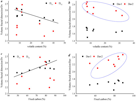 The relationship between volatile matter/fixed carbon and all the fractal dimensions. (a,b) The relationship between the volatile matter of sample Dv1, Dv2 and all fractal dimensions, The relationship between the volatile matter of sample Dav1, Dav2 and all fractal dimensions. (c,d) The relationship between the fixed carbon of sample Dv1, Dv2 and all fractal dimensions, The relationship between the fixed carbon of sample Dav1, Dav2 and all fractal dimensions.