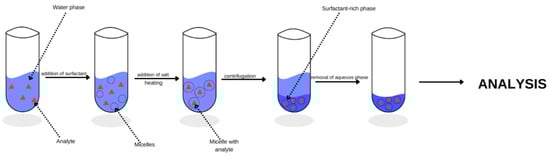 Phase separation is usually accelerated by centrifugation. The system is then cooled to increase the viscosity of the surfactant-rich phase. The final step of CPE involves removing the aqueous (surfactant-poor) phase by decantation and dissolving the surfactant-rich phase in a medium suitable for the chosen detector. The sample thus prepared is ready for quantification of the selected analyte [4,21]. The scheme of CPE is presented in Figure 1.