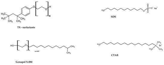 The structural formulas of TX-surfactants, SDS, Genapol X-080, and CTAB.