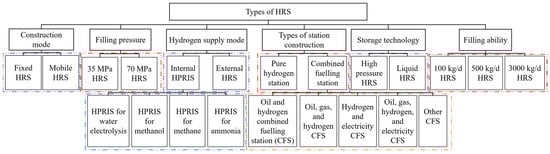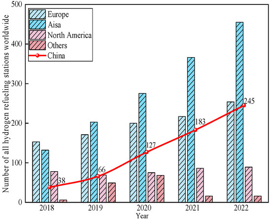 Hydrogen energy can reduce environmental pollution and energy shortage to a certain extent [1,2,3]. Hydrogen has been widely recognised as one of the most promising energy sources in the 21st century due to its cleanliness and efficiency, as well as its abundance [4,5,6]. Numerous countries have prioritised hydrogen development in production, preservation, transportation, and utilisation to better achieve low-carbon economies. Hydrogen refuelling stations (HRSs) play a pivotal role in the future of hydrogen energy [7,8]. Data from the H2 station and the China Hydrogen Energy Alliance indicate that there are over 800 HRSs worldwide, with China accounting for 245 by the end of 2022, as illustrated in Figure 1. China has rapidly developed various types of HRSs, as depicted in Figure 2. Hydrogen-producing and refuelling integrated stations (HPRISs) integrate hydrogen production, preservation, and utilisation for various typical applications. HPRISs could mitigate the risks associated with transport to some extent. Hydrogen exhibits a wide inflammability range (4–75%) and low ignition energy (0.018 mJ) [9]. These properties tend to trigger spontaneous combustion, jet fires, flash fires, combustion, and explosions, resulting in additional personal casualties and property losses [10,11]. Moreover, hydrogen in the high temperatures and pressures (typically 35 to 70 MPa) of HPRISs is prone to leakage. In recent years, hydrogen incidents have attracted distinct attention worldwide. Norway experienced a hydrogen safety incident in 2019 that resulted in two injuries. In the USA, North Carolina experienced a hydrogen explosion, causing approximately 60 houses to be damaged. Implementing immediate safety measures during the initial stages could minimise the risk of hydrogen incidents.