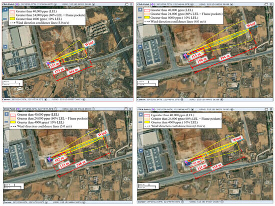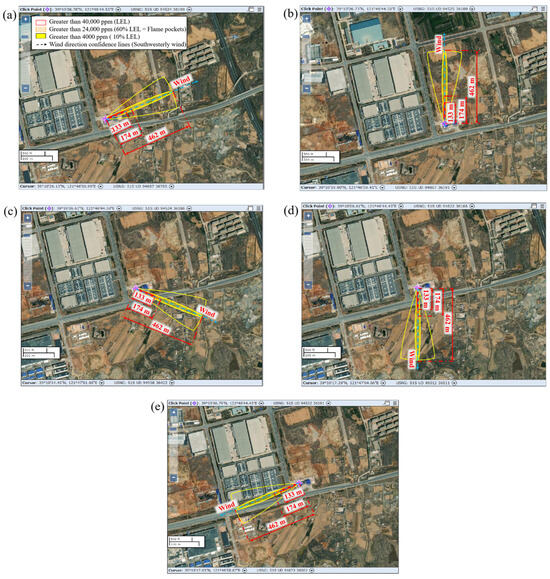 ALOHA, known as a calculation program, was jointly developed by the Environmental Protection Agency (EPA) and the National Oceanic and Atmospheric Administration (NOAA) of the USA for the comprehensive assessment of the impact of hazardous chemical leakage [60,61]. It can be used to calculate the expansion process of hazardous chemicals in space to obtain the distribution of hazardous chemicals after leakage and the radiation range of potential accidents [62]. The critical concentration of fuel in the air is the inflammability level of concern. Fuel may pose a risk of inflammability when the concentration exceeds a certain threshold. The default indexes for the inflammable gas cloud of unignited HL were 40,000 ppm, 10% LEL, and 60% LEL.