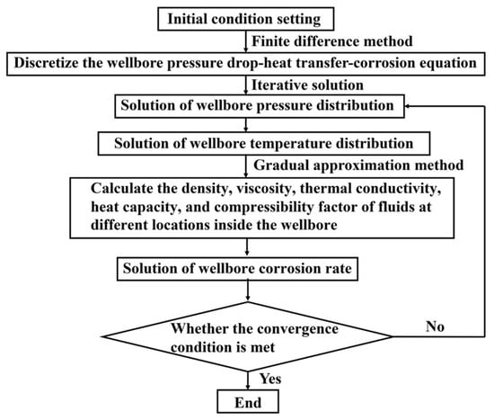 The model is solved by programming in Python 3.9.13, the finite difference method is used to discretize the model and the coupled pressure drop, heat transfer and corrosion models are iteratively solved to obtain a more accurate multi-physical field distribution in the wellbore. The detailed solution process is shown in Figure 1.