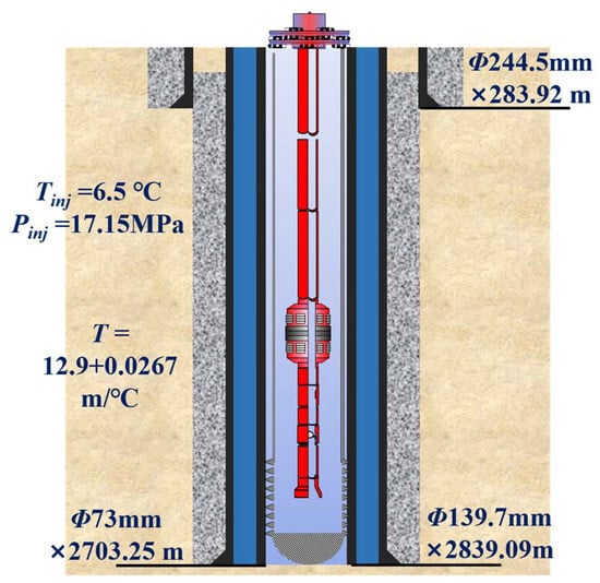 At present, researchers have established a prediction model for wellbore temperature and pressure (abbreviated as “temperature and pressure”) during the CO2 injection process [,,]. It takes into account injection conditions such as liquid or supercritical CO2 and analyzes the effects of phase change, friction effect between fluid and tubing, and radial heat transfer in the wellbore on wellbore temperature and pressure. Since the thermophysical properties of CO2 are greatly affected by temperature and pressure, it is necessary to determine the temperature and pressure in advance when analyzing the flow and heat transfer process of CO2. Therefore, most of these models are solved using an iterative method. Most scholars choose the Peng–Robinson state equation with relatively simple parameters to determine the thermophysical properties of CO2 [,], while some scholars use the Span–Wagner state equation with higher accuracy for calculation [,]. In addition, there are also research works that have conducted special analyses on natural convection in the annulus of oil casing [], periodic injection and other issues. Using the wellbore temperature and pressure prediction model, domestic and foreign scholars have conducted a lot of research on the stress distribution of CO2 injection wellbore, such as the impact of different injection conditions [], wellbore structural material degradation, micro-annulus and fluid migration caused by thermal stress at the cement/casing/rock interface [] and temperature and pressure changes on wellbore integrity [,].
