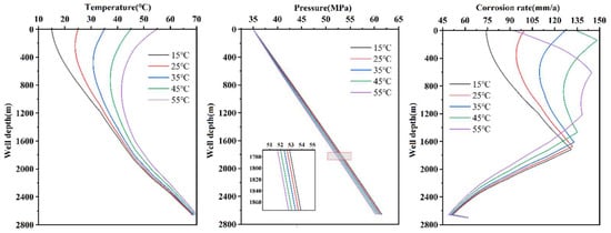 Injection temperatures of 15 °C, 25 °C, 35 °C, 45 °C and 55 °C were selected to calculate the variation of fluid temperature, pressure and corrosion rate with well depth inside the tubing. The results are shown in Figure 5. As the injection temperature increases, the fluid temperature inside the tubing rises significantly, with the temperature change near the wellhead being particularly notable. As depth increases, the fluid temperature gradually rises toward the formation temperature. Below 1800 m, the temperature difference between the deep formation fluid and the formation itself becomes smaller, leading to a lower heat conduction efficiency, which slows the rate of temperature change and the temperature variation becomes less pronounced. The effect of injection temperature on tubing pressure is relatively minor but the overall trend shows a slight decrease in pressure as temperature increases. As the injection temperature rises, the corrosion rate significantly increases within the depth range from the wellhead to 1800 m, as the higher temperature accelerates the corrosion process. Beyond 1800 m, the corrosion rate stabilizes with respect to injection temperature and gradually decreases with increasing depth. Therefore, the corrosion rate inside the tubing first increases and then decreases with depth, exhibiting a clear inflection point. The higher the injection temperature at the wellhead, the sooner the fluid inside the tubing reaches the temperature corresponding to the maximum corrosion rate at shallower depths, thus causing the inflection point to shift upwards with increasing injection temperature.
