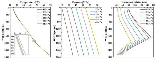 Injection pressures of 15, 25, 35, 45 and 55 MPa were selected to calculate the changes in fluid temperature, pressure and corrosion rate along the wellbore with depth. The results are shown in Figure 6. As seen from the figure, the variation in injection pressure has a minimal effect on the temperature distribution within the wellbore, with temperature curves remaining relatively consistent. As the injection pressure increases, the overall wellbore pressure increases significantly, showing a linear trend. With higher injection pressures, the corrosion rate in the wellbore noticeably decreases, following a trend of initially increasing and then decreasing with depth. The horizontal shift of each pressure curve indicates that lower injection pressures lead to a significant increase in the corrosion rate throughout the entire wellbore. In the upper section of the wellbore, the corrosion rate gradually increases with depth, showing a pronounced rise. In the middle section of the wellbore, the corrosion rate increases rapidly, reaching its peak. In the lower section of the wellbore, the corrosion rate gradually decreases.