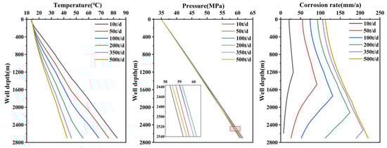 The wellbore temperature, pressure and corrosion rate profiles under different injection volumes.