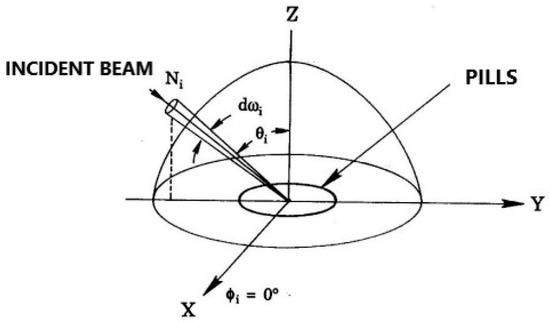 A solar radiation incident on a pill surface undergoes reflection and absorption at varying intensities. The reflectance coefficient serves as a parameter quantifying the proportion of solar light that is absorbed and reflected from the pill’s surface [9]. The directional reflectance (directional reflectance determines how effectively a surface reflects light in a given direction compared to the incident light) coefficient is specifically defined as the ratio of total energy reflected from the intermediate half-space to the energy incident on the surface from the directions θi and φi (Figure 1) [10].