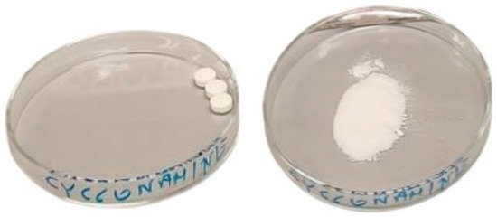 The reflectance and emissivity measurements were conducted on tablets in both intact and crushed forms, as illustrated in Figure 2, which shows exemplary tablets in their intact and crushed forms.