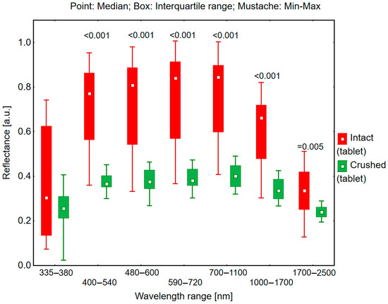 The differences in reflectance of whole and crushed tablets depended on their color (Table S1 in Supplementary Materials). The reflectance of white tablets decreased in a statistically significant way at almost all wavelength ranges, and at 335–380 nm, it was close to achieving statistical significance (p = 0.078). The median reflectance of white tablets at subsequent wavelength ranges decreased by 335–380 nm—0.047, 400–540 nm—0.405, 480–600 nm—0.432, 590–720 nm—0.459, 700–1100 nm—0.444, 1000–1700 nm—0.327, and 1700–2500 nm—0.095, respectively.
