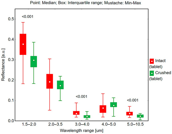 For measurements at a 20° incidence angle, a comparison between intact and crushed tablets revealed statistically significant differences in reflectance at wavelength ranges of 1.5–2.0 μm (p = 0.001), 3.0–4.0 μm (p < 0.001), and 5.0–10.5 μm (p < 0.001) (Figure 4). No statistically significant differences were observed at wavelength ranges of 2.0–3.5 μm (p = 0.270) and 4.5–5.0 μm (p = 0.294). At the 20° incidence angle, median reflectance decreased by 0.039, 0.014, and 0.014 for the wavelength ranges of 1.5–2.0 μm, 3.0–4.0 μm, and 5.0–10.5 μm, respectively.