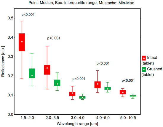 The analysis of reflectance at a 60° incidence angle revealed statistically significant differences between intact and crushed tablets across all wavelength ranges: 1.5–2.0 μm (p < 0.001), 2.0–3.5 μm (p < 0.001), 3.0–4.0 μm (p < 0.001), 4.0–5.0 μm (p = 0.001), and 5.0–10.5 μm (p < 0.001) (Figure 5). The median reflectance decreased by 0.175, 0.083, 0.024, 0.026, and 0.020 for the respective wavelength ranges from 1.5–2.0 μm to 5.0–10.5 μm (p < 0.001) (Figure 5). The median emissivity decreased by 0.175, 0.083, 0.024, 0.026, and 0.020 for the respective wavelength ranges from 1.5–2.0 μm to 5.0–10.5 μm.