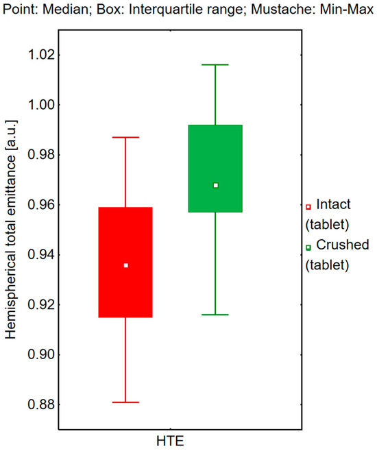 The high temperature emissivity (HTE) comparison between intact and crushed tablets revealed a statistically significant effect on tablet form (p = 0.001) (Figure 6). The median HTE value increased by 0.032.