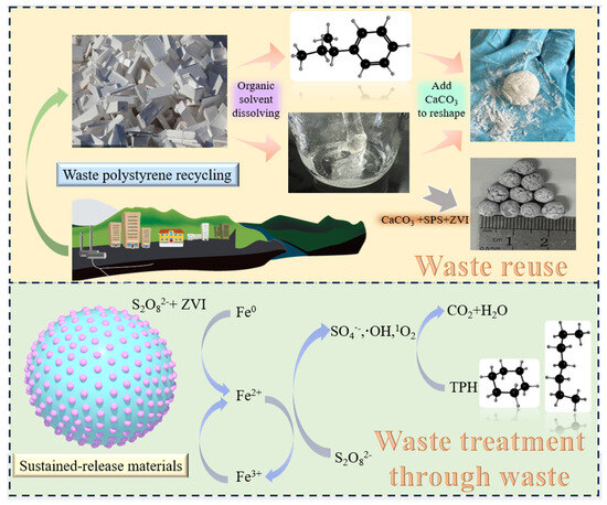 Waste foamed polystyrene (WFPS) was sourced from ordinary household waste. Ethyl acetate (C4H8O2, ≥99.7%), dichloromethane (CH2Cl2, ≥99.7%), cyclohexane (C6H12, ≥99.7%), sodium chloride (NaCl, ≥99.7%), sodium bicarbonate (NaHCO3, ≥99.7%), sodium carbonate (Na2CO3, ≥99.7%), sodium persulfate (Na2S2O8, ≥99.7%), methanol (CH3OH, ≥99.9%), potassium sulfate (K2SO4, ≥99.7%), and sodium hydroxide (NaOH, ≥96%) were procured from InnoChem Science & Technology Co., Ltd. (Beijing, China). Tetrachloroethylene (C2Cl4, ≥99.5%) was supplied by Aoran Fine Chemical Research Institute (Tianjin, China), while carbon tetrachloride (CCl4, ≥99.7%), calcium carbonate (CaCO3, 99.5%), and magnesium silicate adsorbent (MgSiO3, ≥99.7%) were obtained from Aladdin Biochemical Technology Co., Ltd. (Shanghai, China). Anhydrous sodium sulfate (Na2SO4, ≥99.7%) was purchased from Macklin Biochemical Technology Co., Ltd. (Shanghai, China). Zero-valent iron (Fe0, 99.9%) powder was supplied by Xindun Alloy Welding Material Spraying Co., Ltd. (Nangong, China). Sulfuric acid (H2SO4, ≥99.8%) was obtained from Xilong Scientific Co., Ltd. (Shantou, China). All reagents were used without further purification. Deionized water, deoxygenated prior to use, was utilized throughout the study.