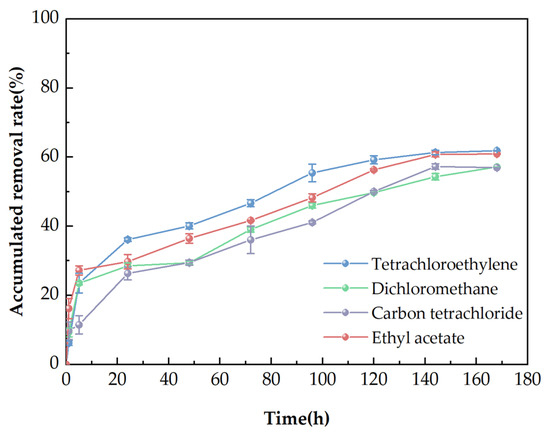 The experimental results are shown in Figure 2. During a 7-day (168 h) static reaction, the materials prepared with ethyl acetate and tetrachloroethylene demonstrated superior aniline removal efficiencies. The degradation rate of aniline by the material prepared with ethyl acetate reached 60.94%, while the material prepared with tetrachloroethylene achieved a comparable degradation rate of 61.86%.
