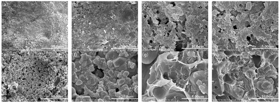 In contrast, the SEM images after the reaction (Figure 3e–h) exhibit significant morphological changes. The surface of the material displays markedly larger pores compared to the pre-reaction state. This change is attributed to the dissolution of surface oxidants upon contact with water, which creates pathways for water to penetrate the material’s interior. As the reaction progresses, further dissolution of internal oxidants leads to the continuous formation of new pores, resulting in a highly porous structure after leaching.