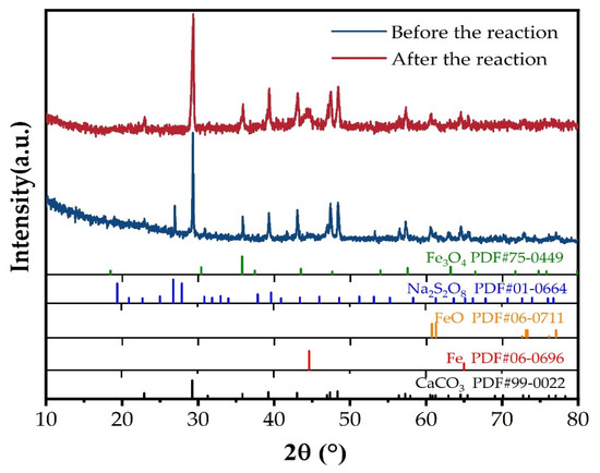 The XRD patterns of the (SPS+ZVI)/WFPS-2 material before and after the reaction are shown in Figure 4. The primary crystalline phase identified in both the pre- and post-reaction samples was CaCO3, with strong diffraction peaks observed at 2θ = 29.4°, 39.41°, and 48.51°, corresponding to the (104), (113), and (116) planes of hexagonal CaCO3 (PDF 99-0022).