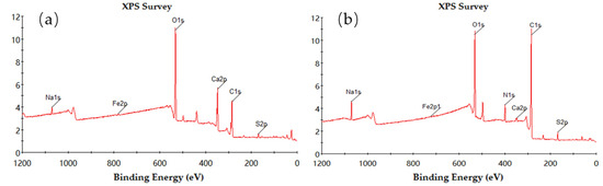 The surface elemental composition of the (SPS+ZVI)/WFPS-2 material before and after the reaction was analyzed using XPS, and the results are shown in Figure 5. Before the reaction (Figure 5a), the dominant surface element was calcium. After the reaction (Figure 5b), the sodium and sulfur contents increased. This is likely due to the gradual leaching of sodium persulfate (SPS) as it dissolves in water, with unreacted SPS accumulating on the surface of the material particles. Additionally, nitrogen was detected on the post-reaction material surface, attributed to nitrogen-containing compounds formed as residual byproducts of aniline degradation.