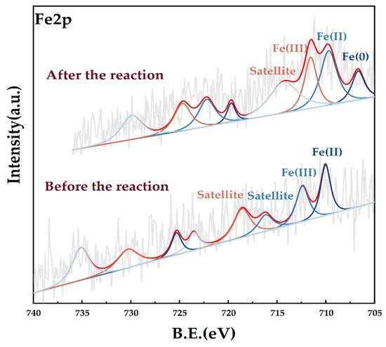 After the reaction, the relative amount of Fe3+ increased significantly, with its peak area reaching 1.5 times that of the pre-reaction state. This increase is attributed to the rapid oxidation of ZVI to Fe3+ during the activation process of SPS, as described by reaction Equations (1)–(4). Additionally, a peak corresponding to Fe0 was observed at a binding energy of 706.67 eV. The presence of Fe0 is likely due to the effective encapsulation of ZVI within the material, preventing its oxidation until it was released to the surface during the reaction. The proportion of Fe2+ remained relatively stable at 48% post-reaction, as Fe2+ plays a critical role in activating SPS to generate reactive radicals for pollutant degradation [44].